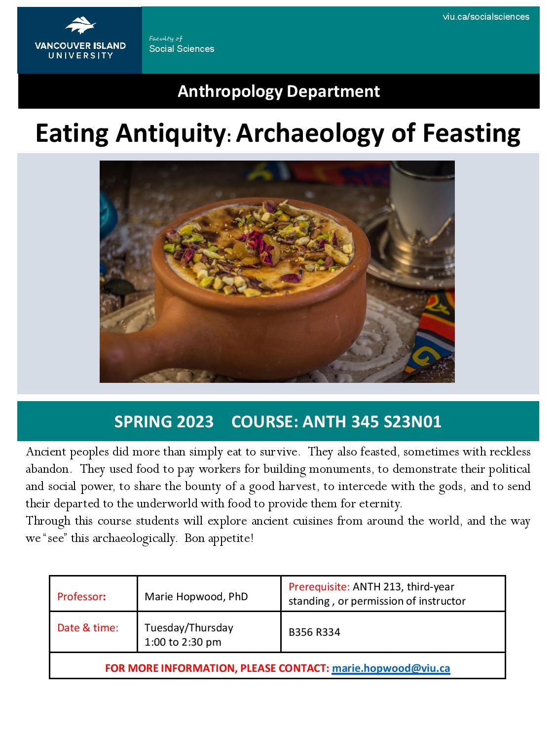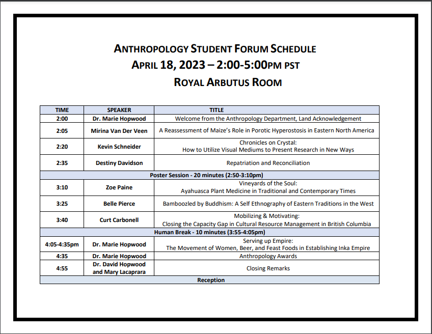 This is a snapshot of courses, projects, events, and activities undertaken by students and faculty of the Department of Anthropology, Vancouver Island University from Intersession 2022 to Spring 2023.