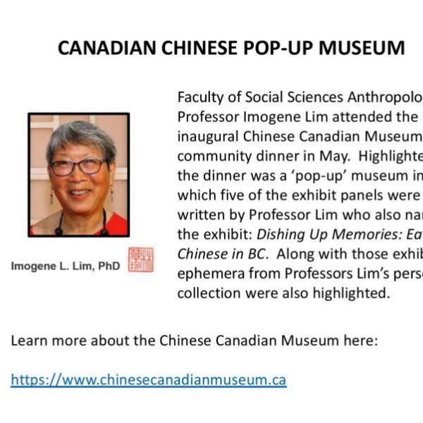 - Dr. Imogene Lim co-curated, with Sophie Yamauchi, a pop-up exhibit, Dishing Up Memories: Eating Chinese in BC, for the Chinese Canadian Museum, May 28, 2022.